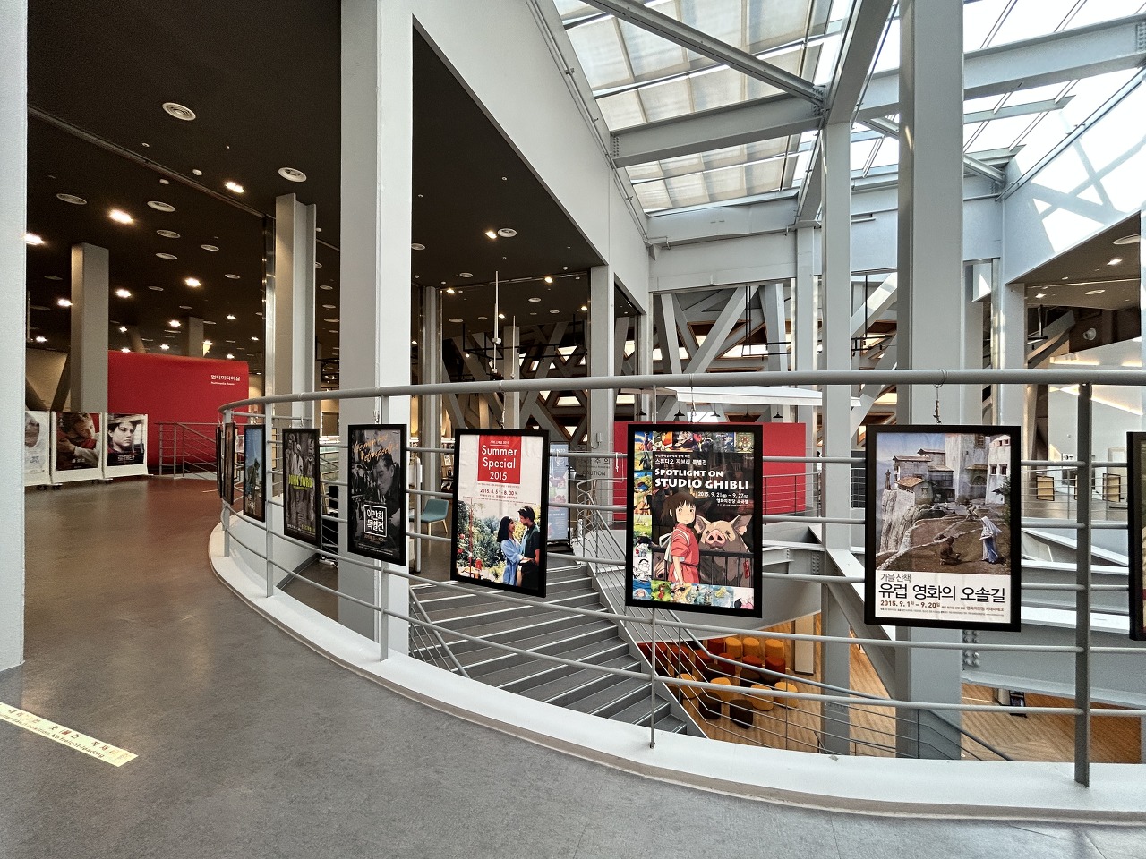 장서는 영화 관련 단행본과 고전문학, 그리고 영화 OST 수록 LP판, 대본 등이 있는 것 같았다. 열람석은 생각보다 많지 않았는데, 사람들이 꽉꽉 들어차있었다. 이용률이 꽤 좋은 듯 하다. LP판을 감상할 수 있는 좌석이 여러곳 있었는데, 듣고싶은 LP를 마음대로 감상하는 시스템은 아닌 것 같고, 직원에게 문의하면 들을 수 있는 것 같았다. 한쪽엔 지브리 관련 도서를 모아둔 전시서가도 있었다. 일본 느낌 주려고 등 모양 장식을 걸어둔 게 귀여웠다.
