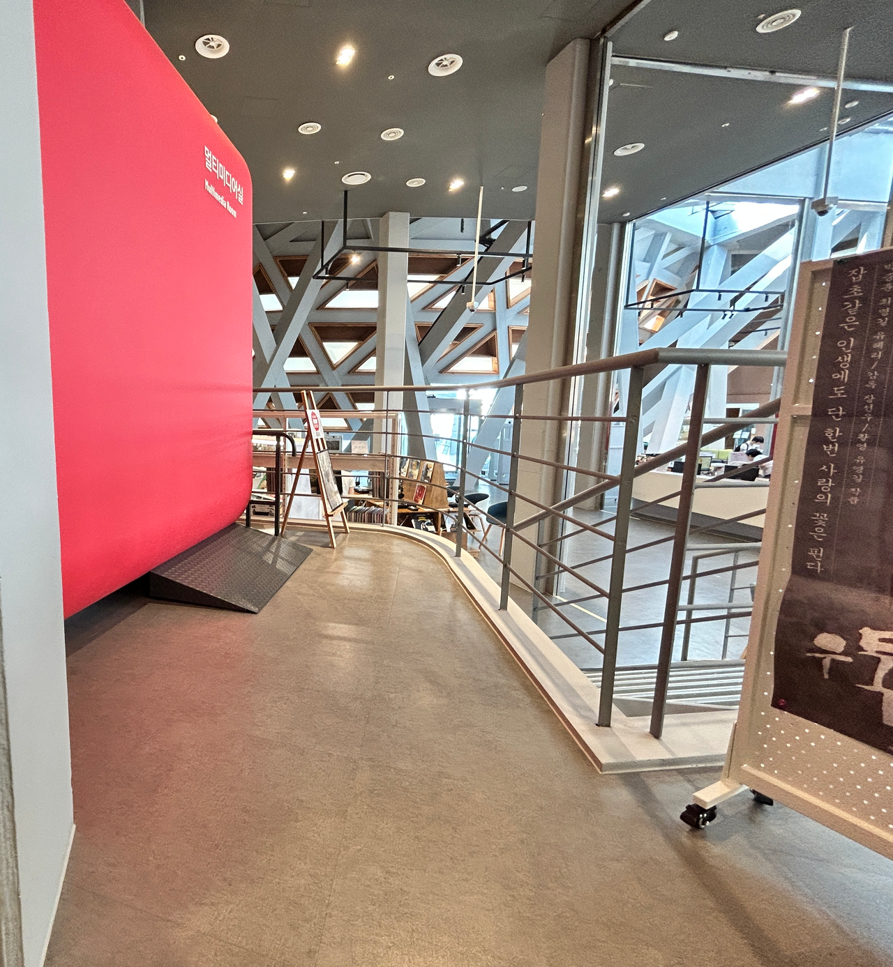 자료실 너머로 반복층스럽게 연결된 곳이 있었는데, 휠체어로 갈 수 있는 경사로도 마련되어있어서 올라갔더니, 영화 감상석이 있었다. 각 칸마다 이용자가 꽤 많았고, 2인석부터 4인석까지 다양했다. 직원 선생님께 다른 도서관에서 일하는데 잠깐 들렀다고, 사진 좀 찍어도 되는지 여쭤보았더니 허락해주시면서 엄청 친절하게 설명해주셨다. 부스형 칸막이라 휠체어는 못올라가겠다 싶었는데 휠체어 사용자가 올라갈 수 있게 경사로도 준비해주셨다며 친절하게 보여주셨다. 준비된 도서관이구나! 의자만 이동식이면 휠체어 대놓고 보기에 딱 좋지 않을까 싶었다.