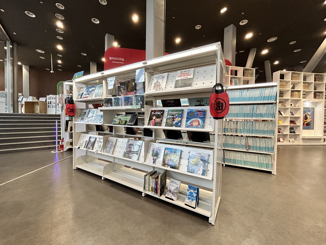 장서는 영화 관련 단행본과 고전문학, 그리고 영화 OST 수록 LP판, 대본 등이 있는 것 같았다. 열람석은 생각보다 많지 않았는데, 사람들이 꽉꽉 들어차있었다. 이용률이 꽤 좋은 듯 하다. LP판을 감상할 수 있는 좌석이 여러곳 있었는데, 듣고싶은 LP를 마음대로 감상하는 시스템은 아닌 것 같고, 직원에게 문의하면 들을 수 있는 것 같았다. 한쪽엔 지브리 관련 도서를 모아둔 전시서가도 있었다. 일본 느낌 주려고 등 모양 장식을 걸어둔 게 귀여웠다.