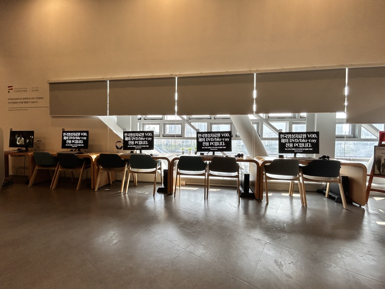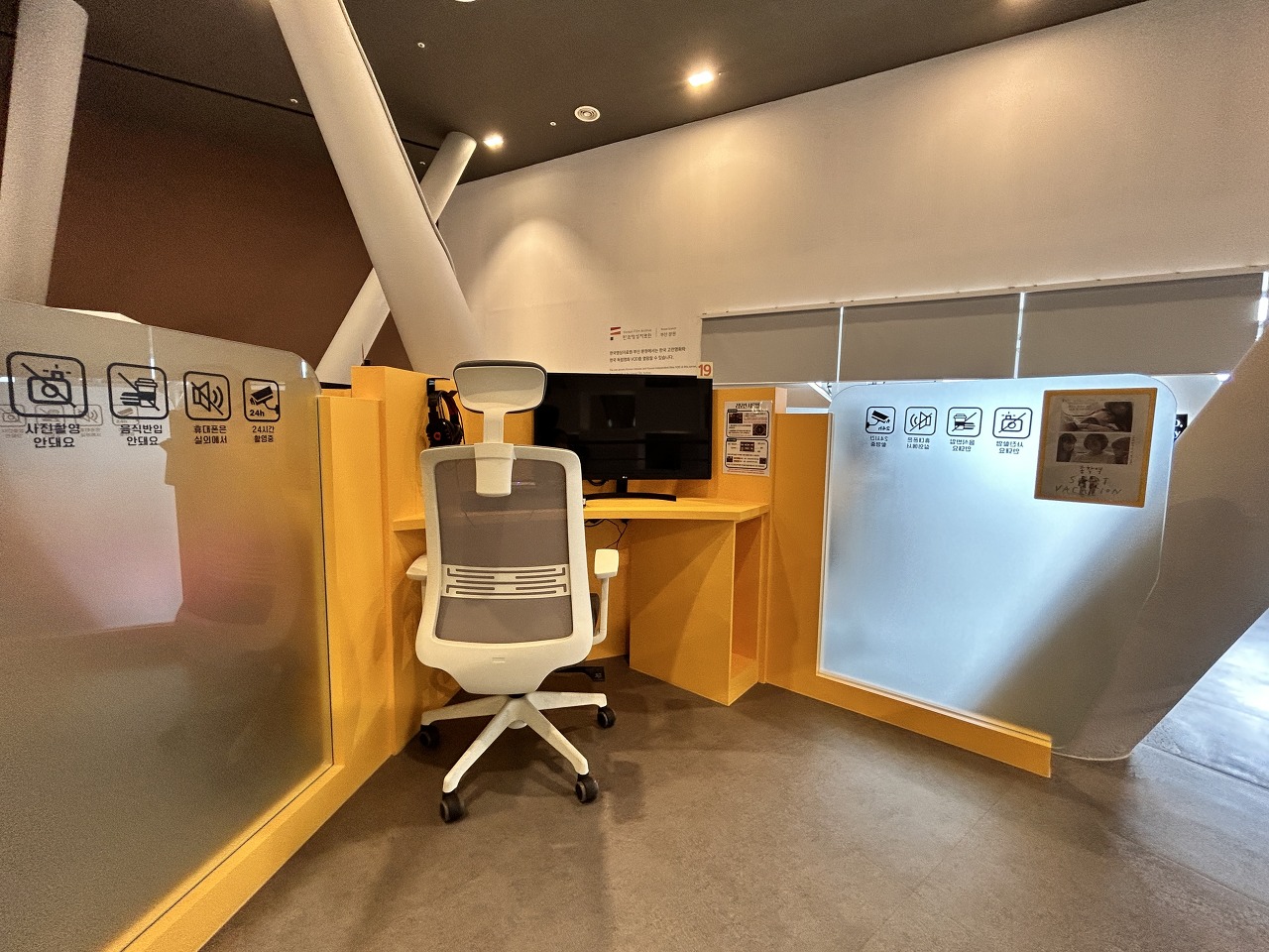 한쪽에는 1인용 감상석도 있었고, 2인이 이용할 수 있는 영화 자료 열람석도 있었는데, 가끔 자리가 다 찰 때 커플 이용자들이 오면 이쪽에서 영화도 감상할 수 있도록 안내해준다고 했다. 좌석이 다양하게 준비된 점이 좋았다.