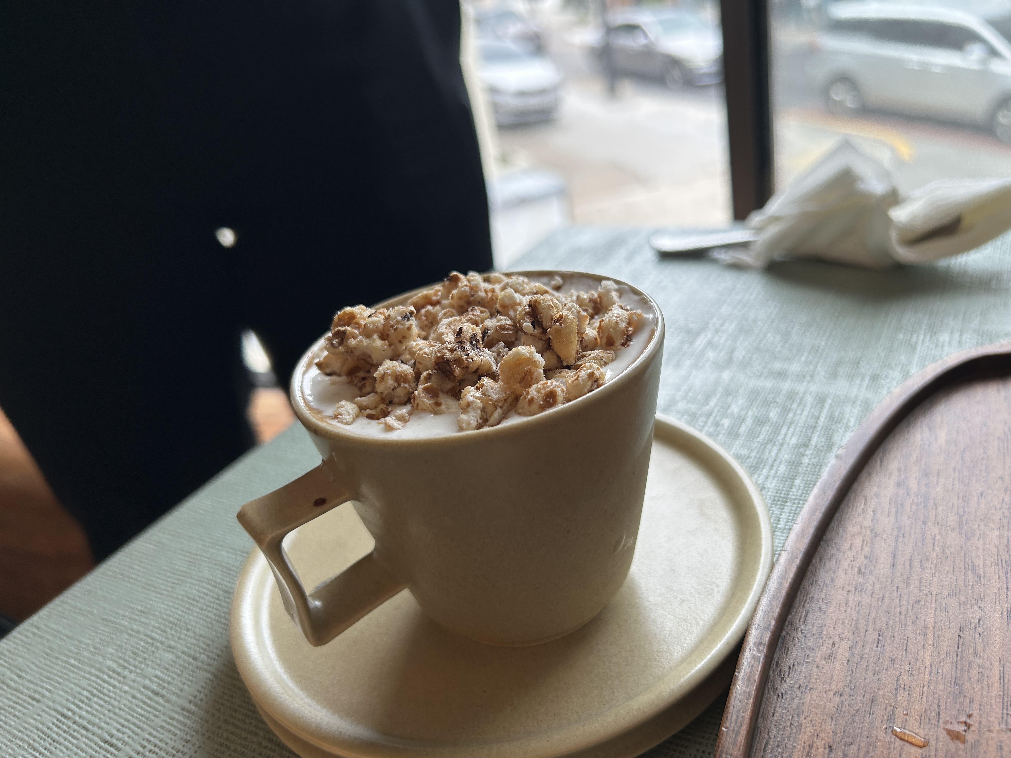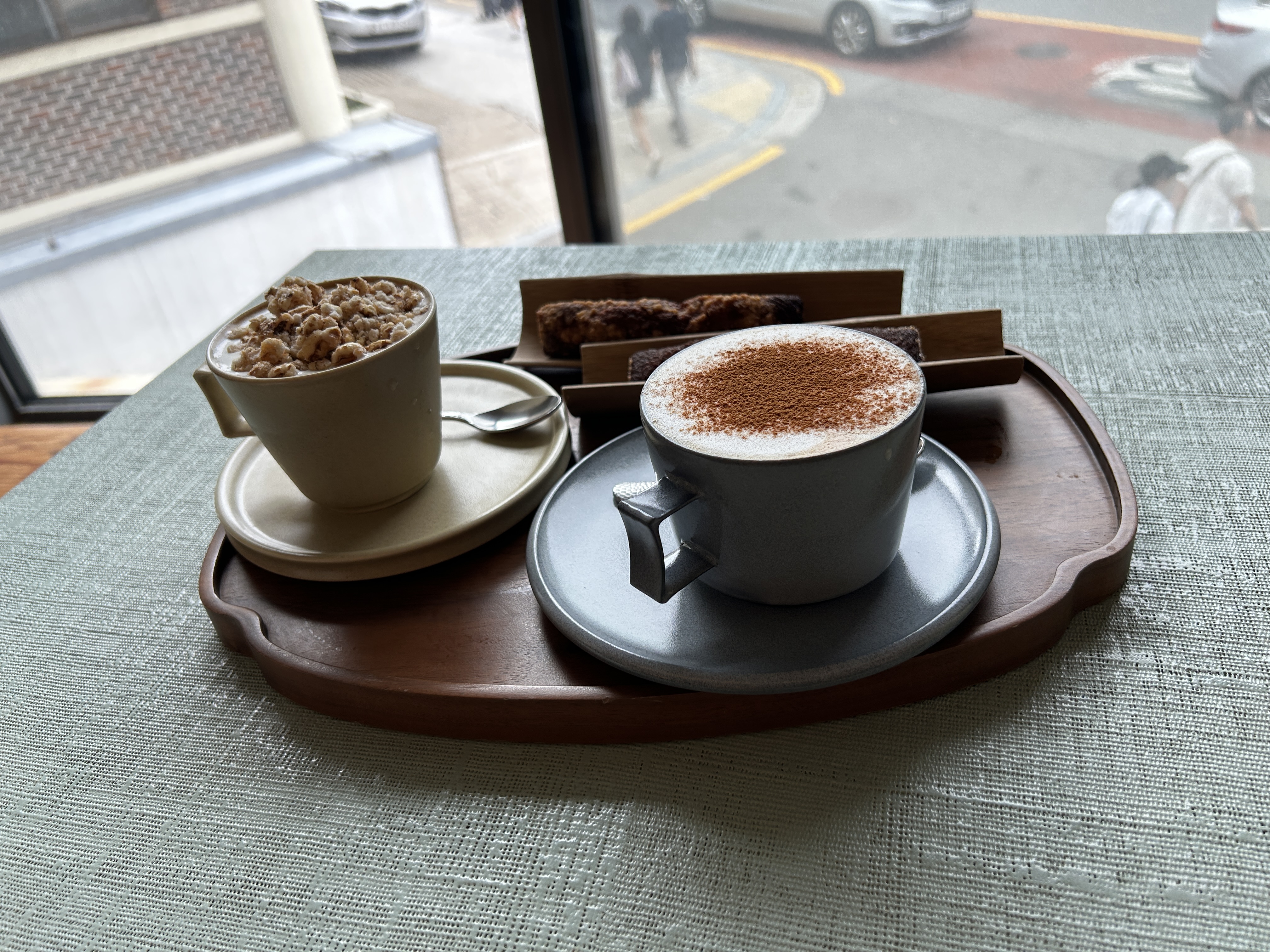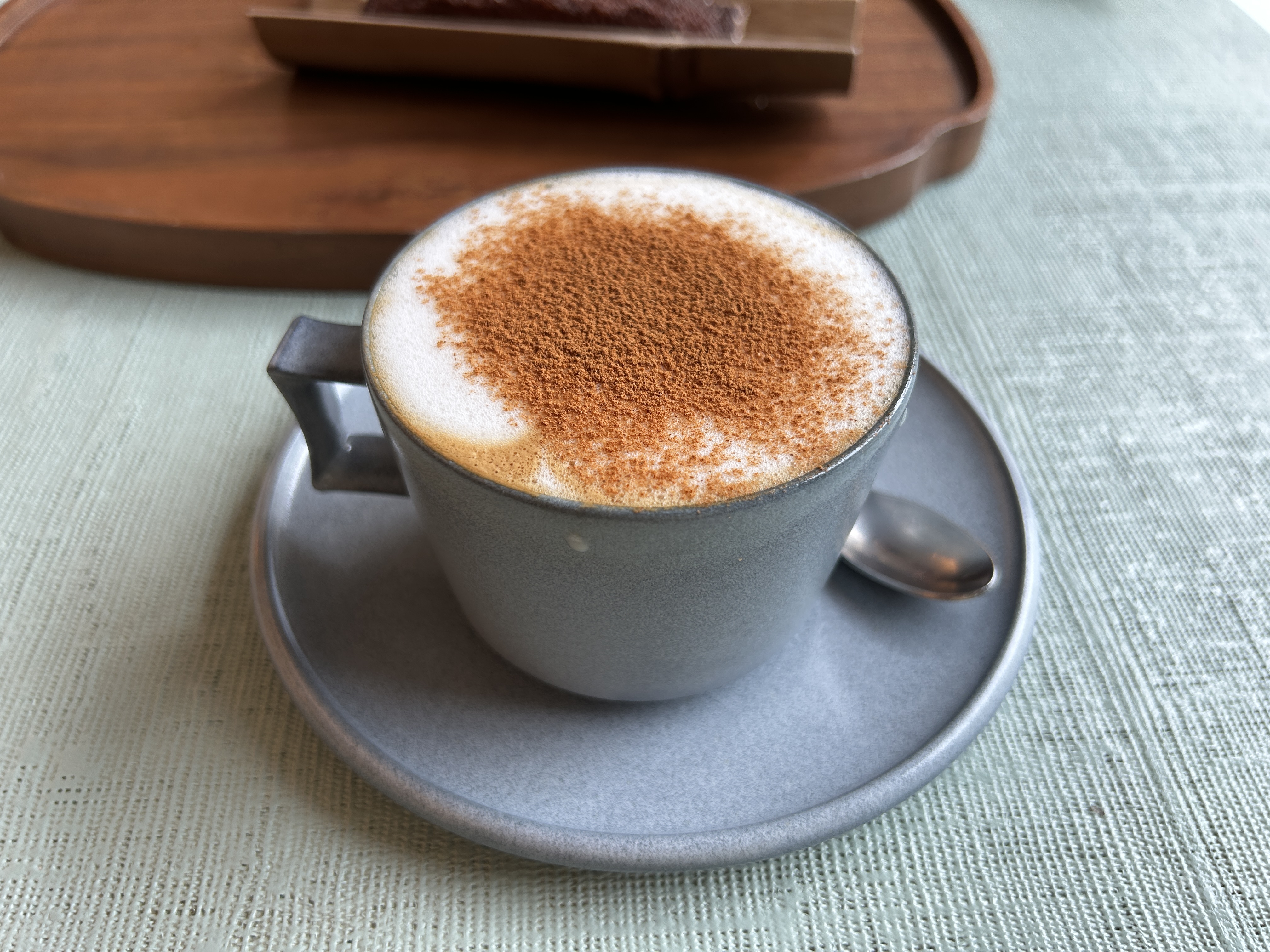 룸메가 시킨 시그니처 이오이 커피. 보리크림커피에 뻥튀기같은 (조리퐁스러운) 과자가 올라가 있다. 요건 아이스로만 주문이 가능하다. 이건 보리우유가 시그니쳐라 오트변경은 안되지만 룸메는 그냥 마셨다. 내가 시킨 건 시나몬 카푸치노. 마침 비염이라 따수운거 좋아서 시켰다. 나는 오트로 변경했다. 맛은? 지인-짜 맛있었다. 일단 시나몬 향이 너무 좋기도 하고, 커피향도 너무 좋아서 한모금 한모금 마실 때마다 맛있다고 느끼면서 마셨다. (단순히 이날 휴가라 기분이 좋아서 더 그랬을수도 있다만)