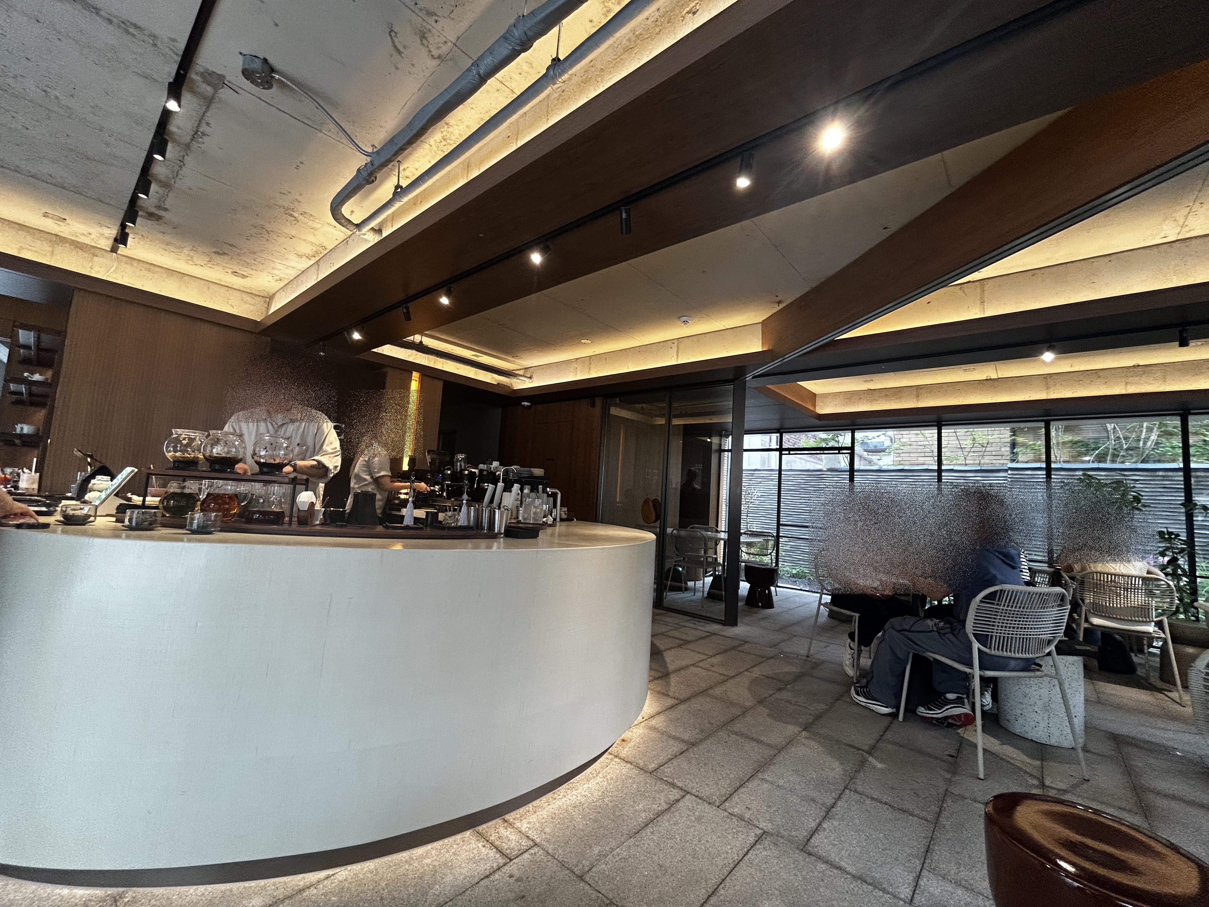 들어가면 꽤 널찍한 공간이 나온다. 여기서 주문을 하고 진동벨 받아 올라가면 되는데, 우리는 그냥 기다렸다가 받아서 2층으로 올라갔다. 저 원형 바 뒤쪽으로 가면 엘리베이터가 있다. 커피 외에도 차가 다양하고, 디저트도 다양한 종류의 휘낭시에가 있었다.