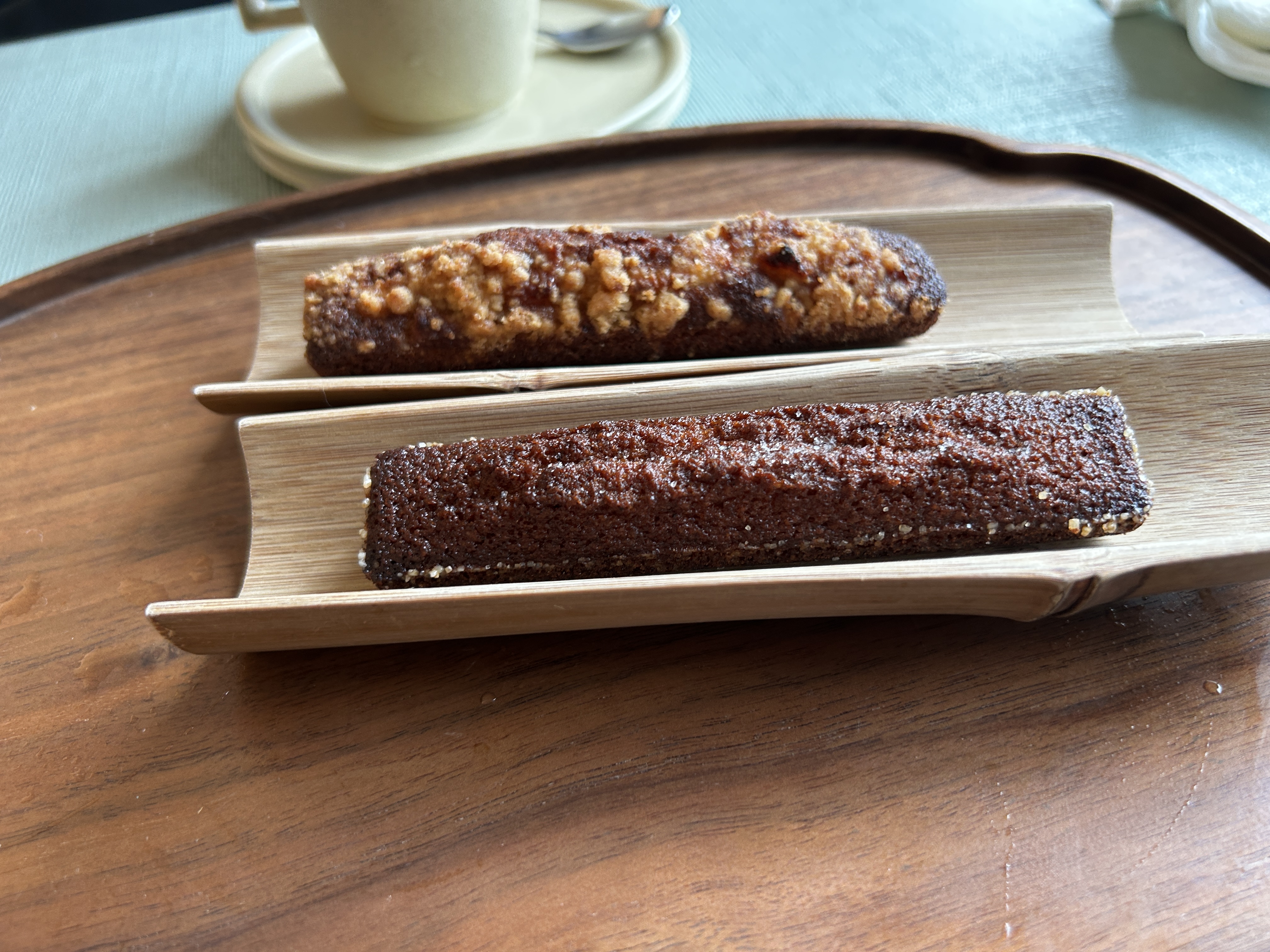 우리가 시킨 휘낭시에는 신안소금 휘낭시에와 청송사과 휘낭시에. 흑임자도 궁금하긴 했는데 꽤 달아보여서 다음기회로 미루었다. 신안소금 휘낭시에는 소금 알갱이가 씹혔는데 불쾌한 느낌은 아니고 적당히 짭쪼롬해서 맛있었다. 청송사과 휘낭시에도 사과 향이 적당히 달콤하게 나서 맛있었다. 저 대나무 그릇도 특이하고 휘낭시에도 그에 맞춰 길쭉한게 특이하고 이뻤다.